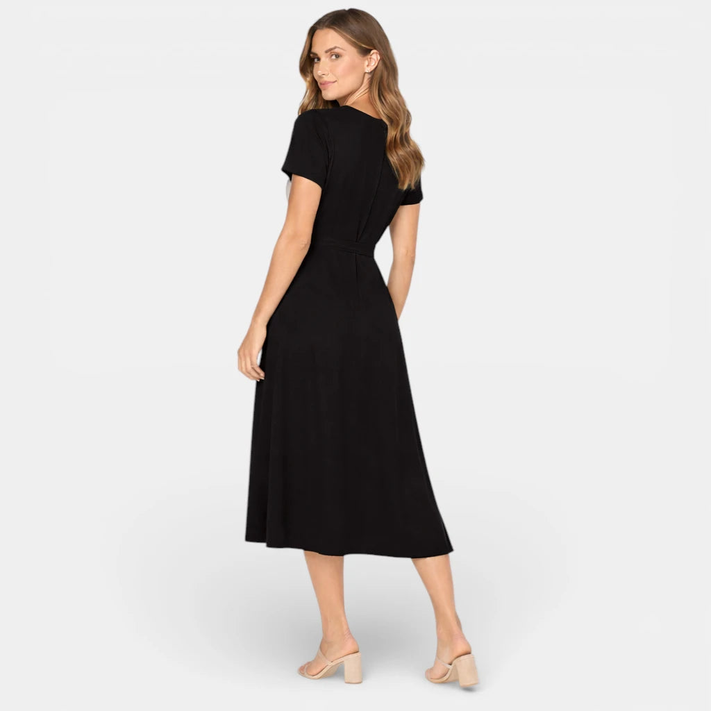 Camilla klassisk midi kjole kombinerer en enkel silhuet med et sofistikeret udtryk. Den figurnære overdel og let udsvungne nederdel skaber en flatterende pasform, mens de korte ærmer giver et stilrent og moderne look. Perfekt til både arbejde, middage eller særlige lejligheder.